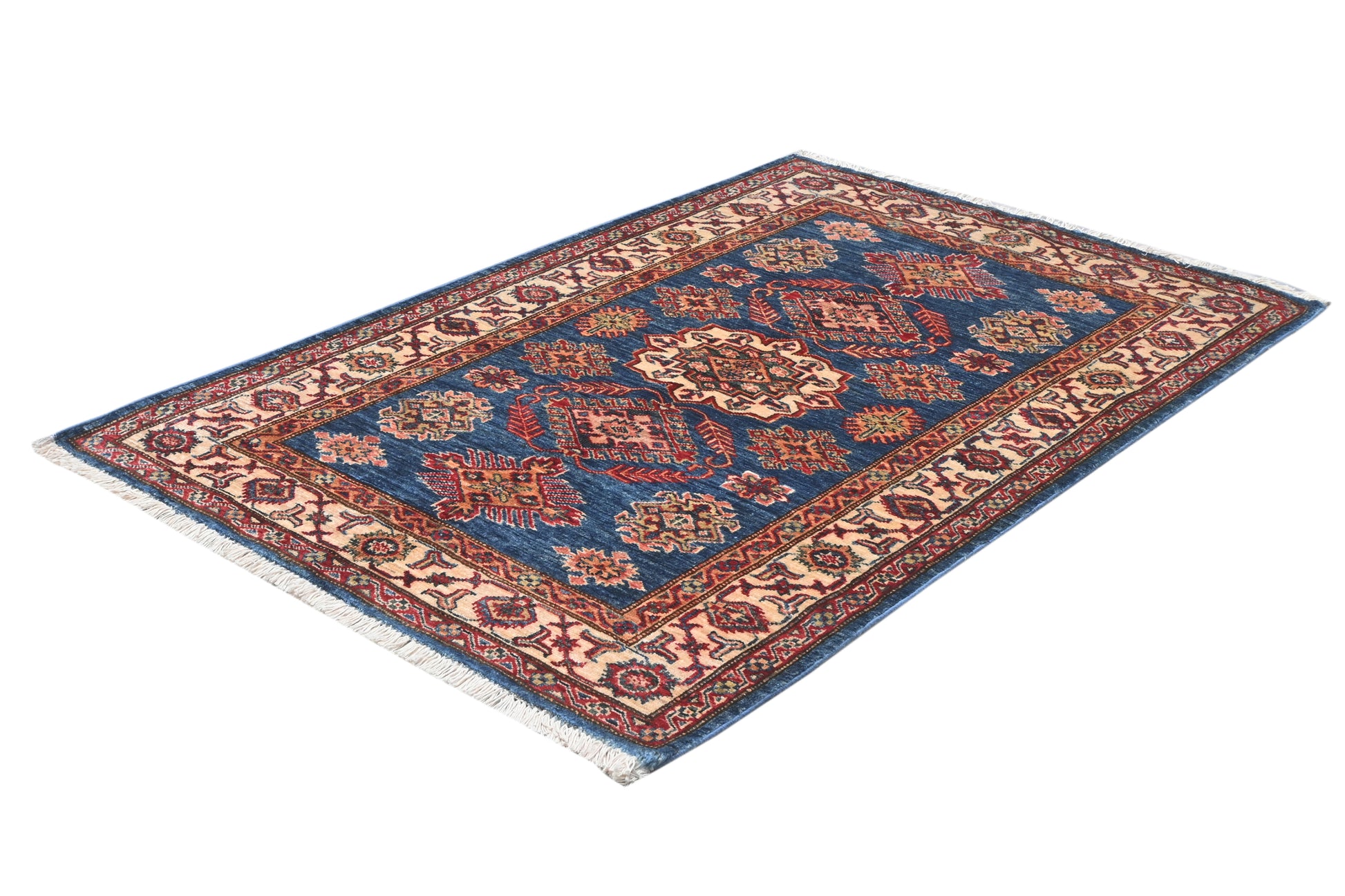 The Kazak rug originates not, as one might think, from Kazakhstan, but rather from the border region where Azerbaijan, Georgia and Armenia trisect. They usually exhibit bright reds and strong blues, and often have three medallions of approximately equal size spaced vertically up the carpet. This Kazakh is made in Afghanistan, and features a prominent abrash effect in its field.
