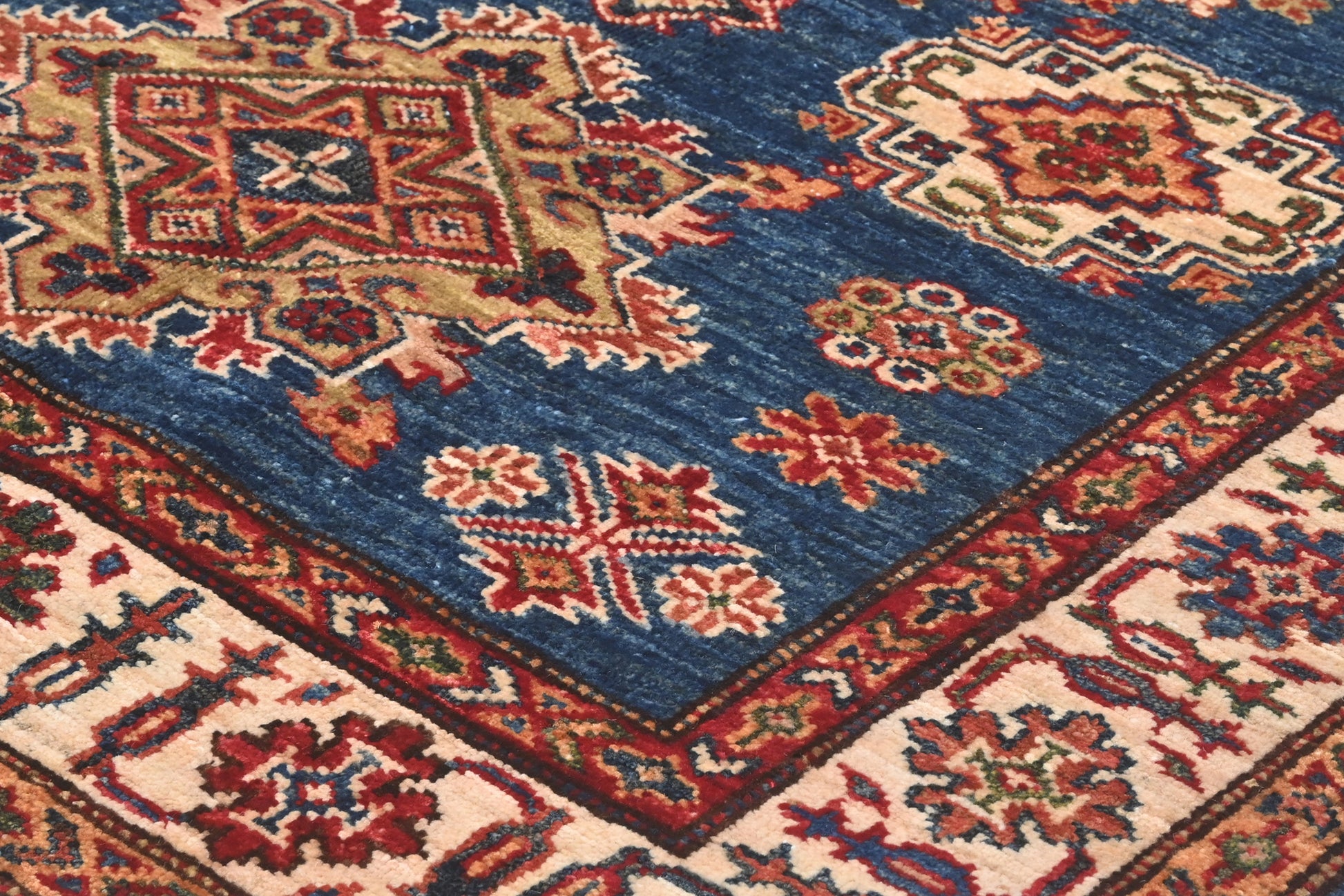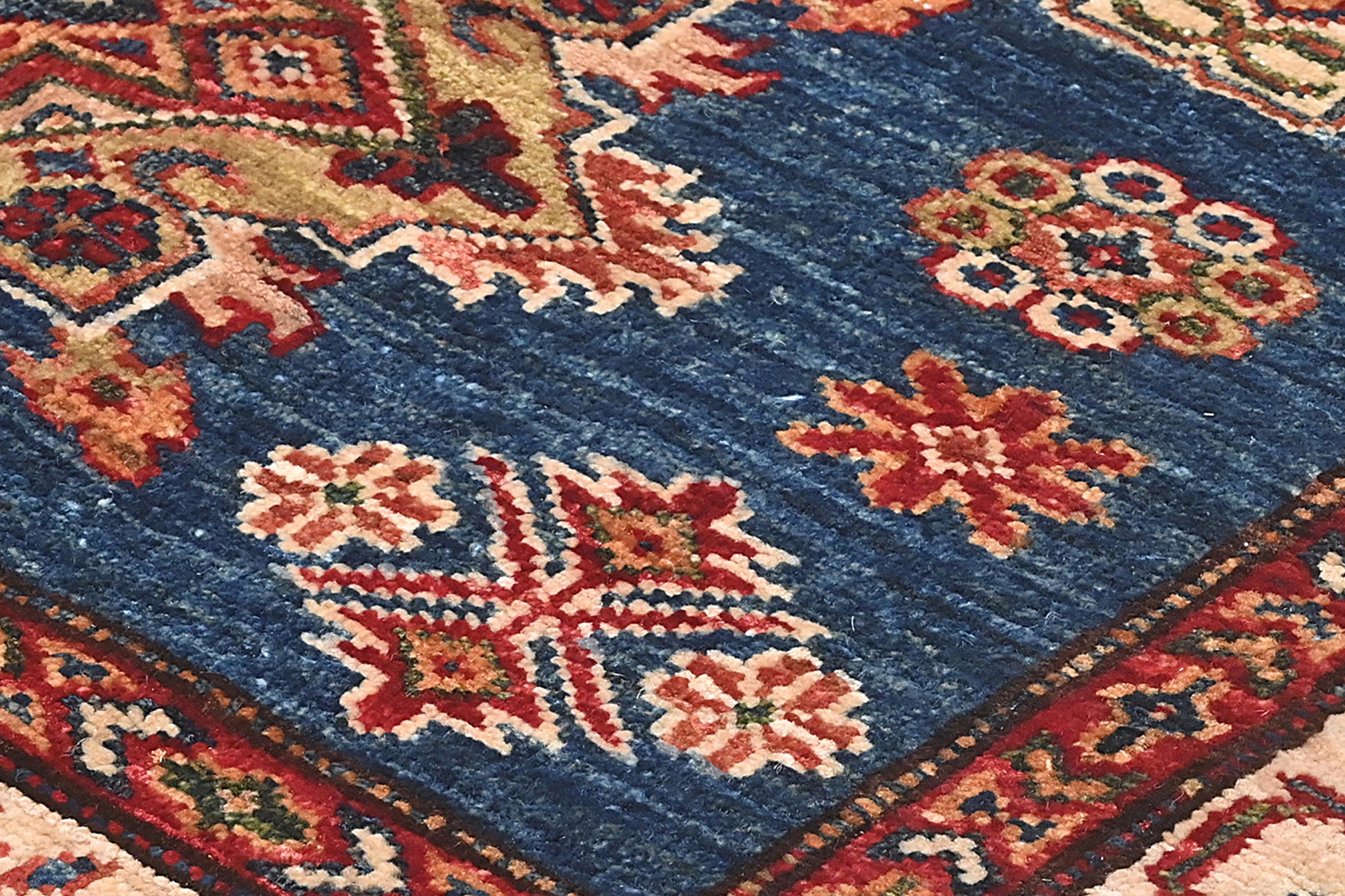The Kazak rug originates not, as one might think, from Kazakhstan, but rather from the border region where Azerbaijan, Georgia and Armenia trisect. They usually exhibit bright reds and strong blues, and often have three medallions of approximately equal size spaced vertically up the carpet. This Kazakh is made in Afghanistan.