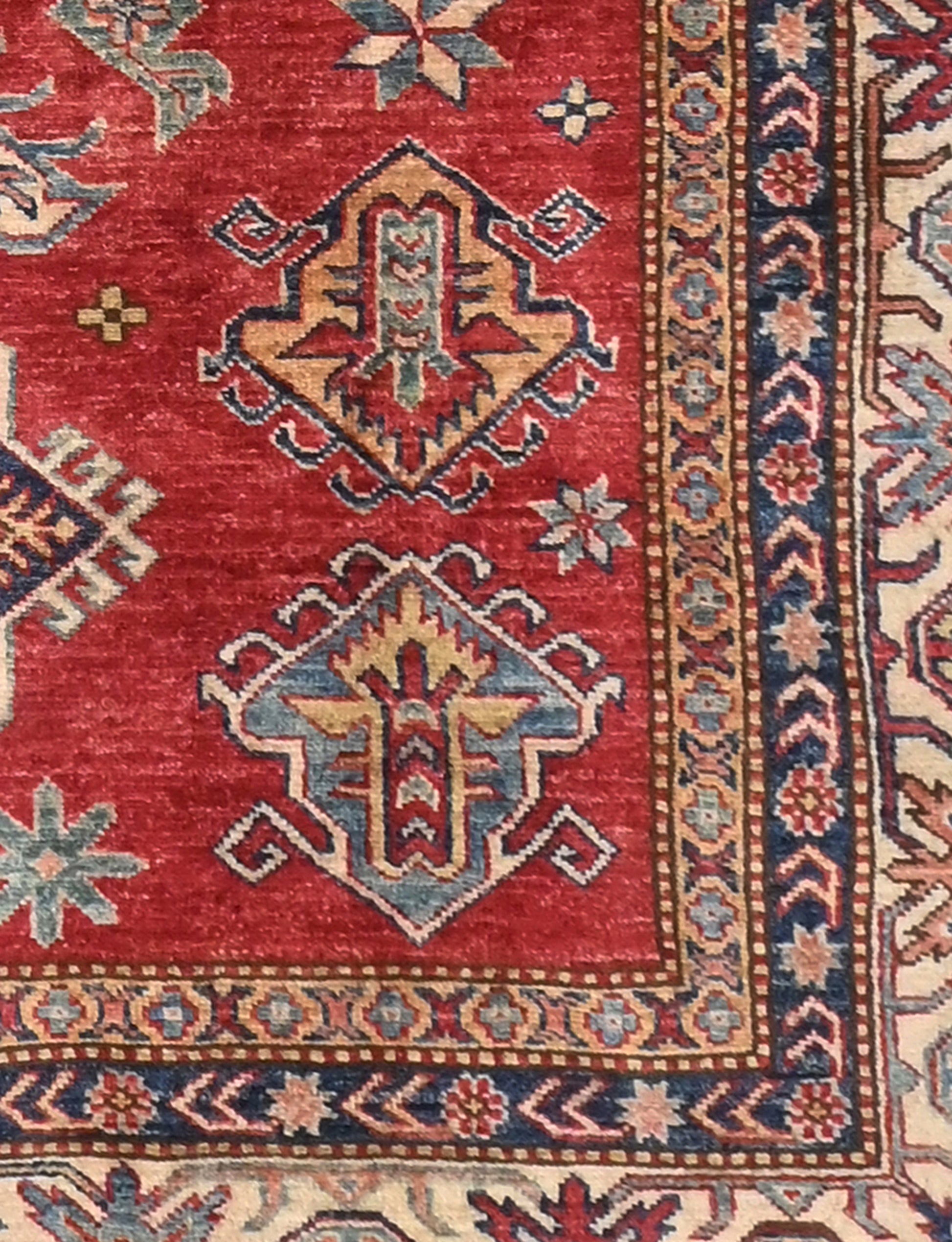 The Kazak rug originates not, as one might think, from Kazakhstan, but rather from the border region where Azerbaijan, Georgia and Armenia trisect. They usually exhibit bright reds and strong blues, and often have three medallions of approximately equal size spaced vertically up the carpet.