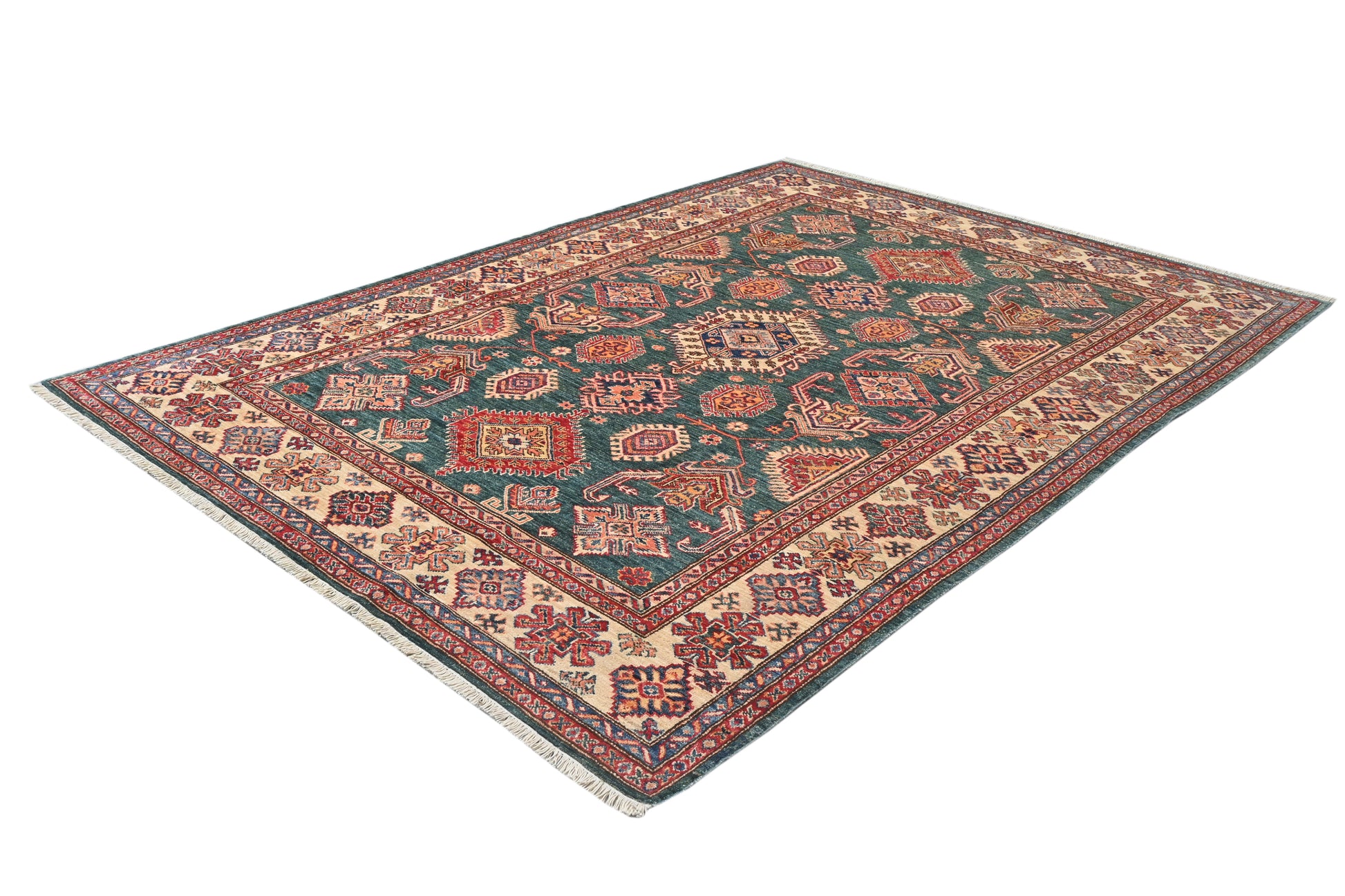 The Kazak rug originates not, as one might think, from Kazakhstan, but rather from the border region where Azerbaijan, Georgia and Armenia trisect. They usually exhibit bright reds and strong blues, and often have three medallions of approximately equal size spaced vertically up the carpet.