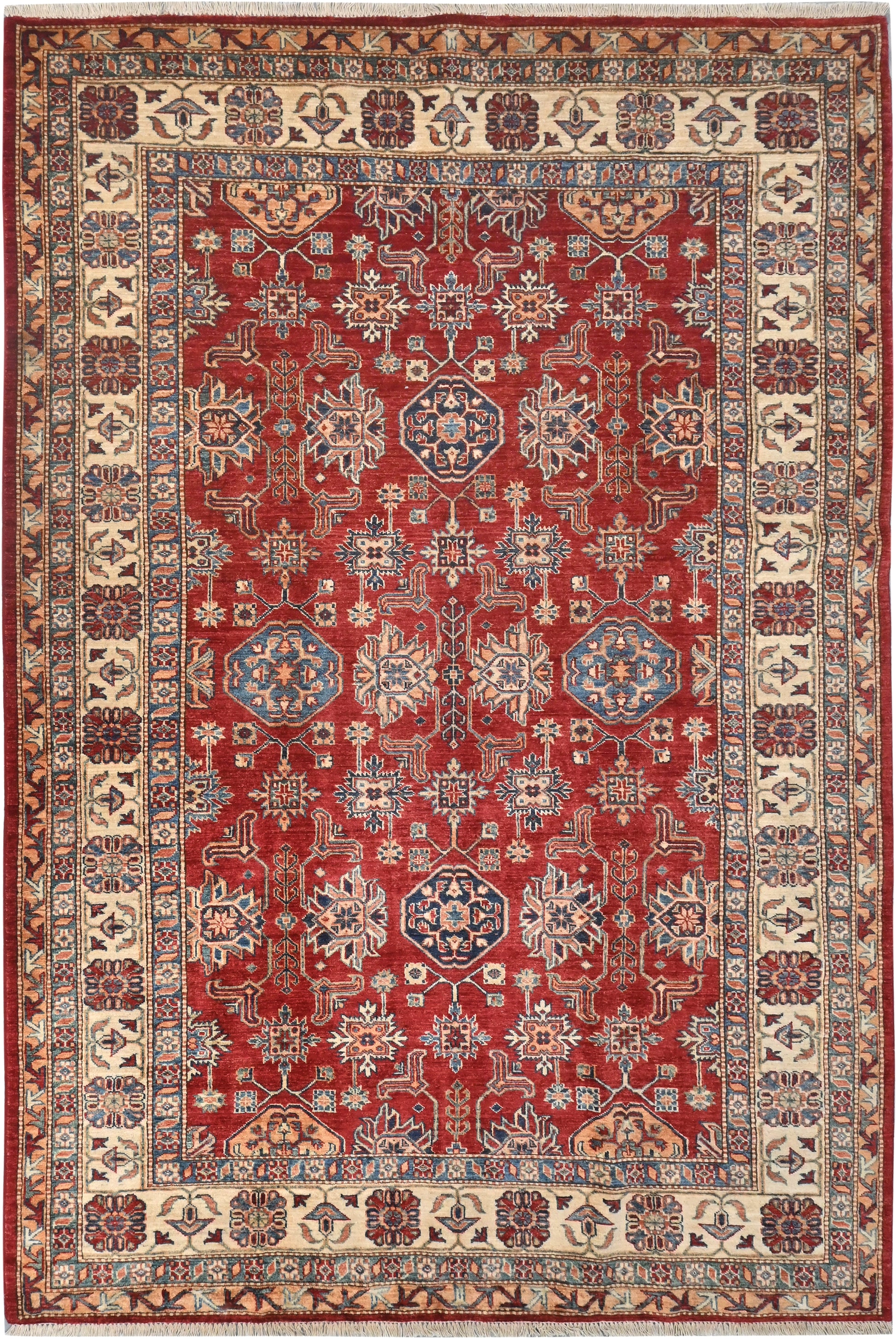 The Kazak rug originates not, as one might think, from Kazakhstan, but rather from the border region where Azerbaijan, Georgia and Armenia trisect. They usually exhibit bright reds and strong blues, and often have three medallions of approximately equal size spaced vertically up the carpet.