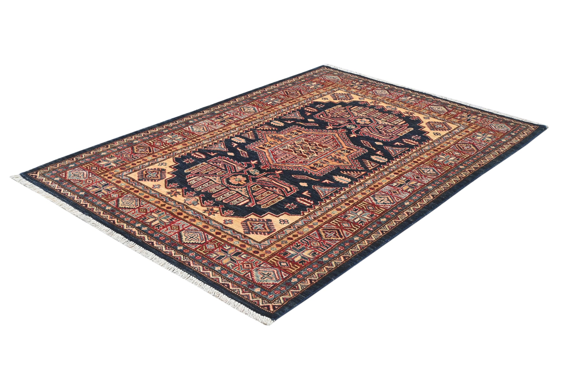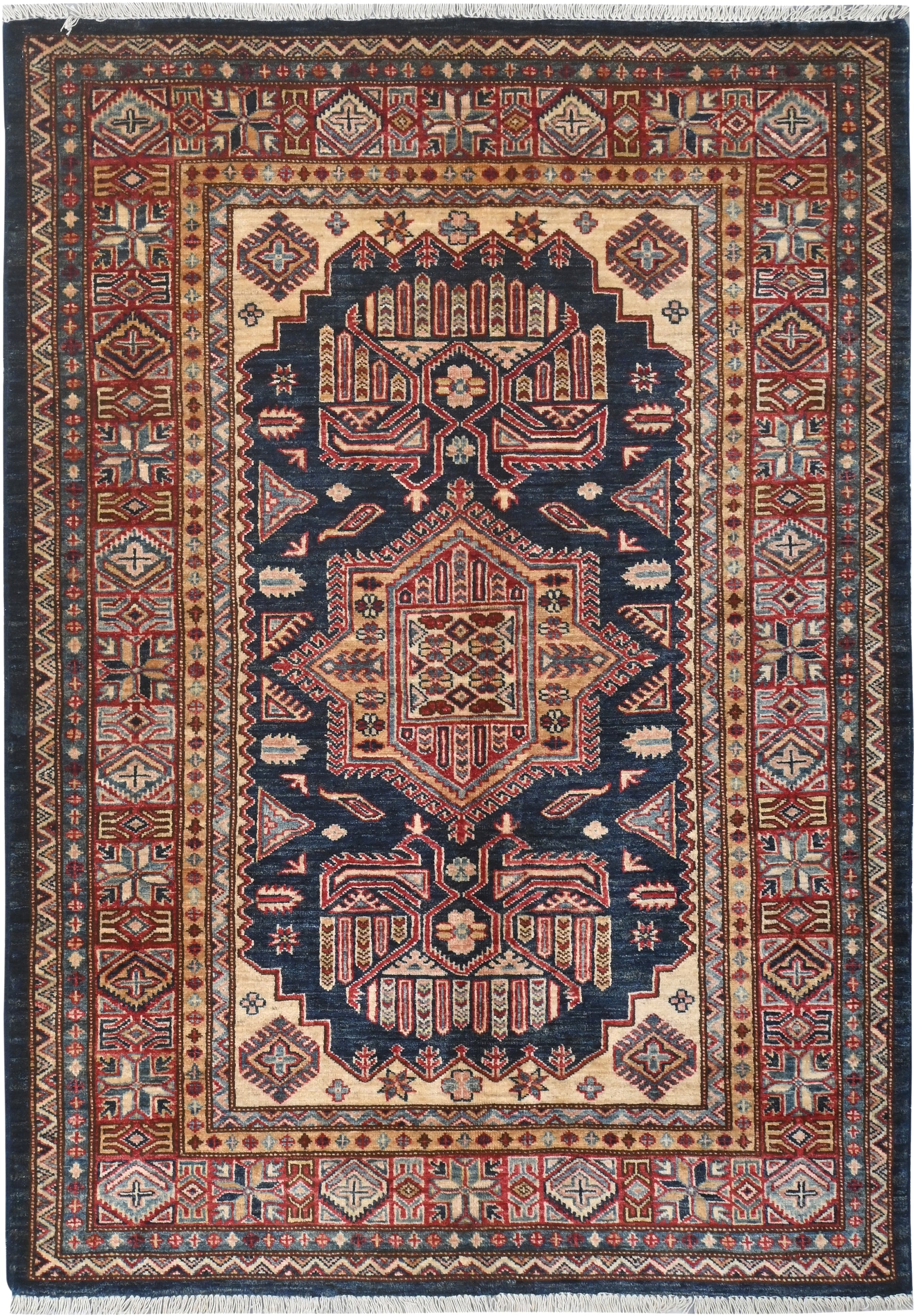 The Kazak rug originates not, as one might think, from Kazakhstan, but rather from the border region where Azerbaijan, Georgia and Armenia trisect. They usually exhibit bright reds and strong blues, and often have three medallions of approximately equal size spaced vertically up the carpet.