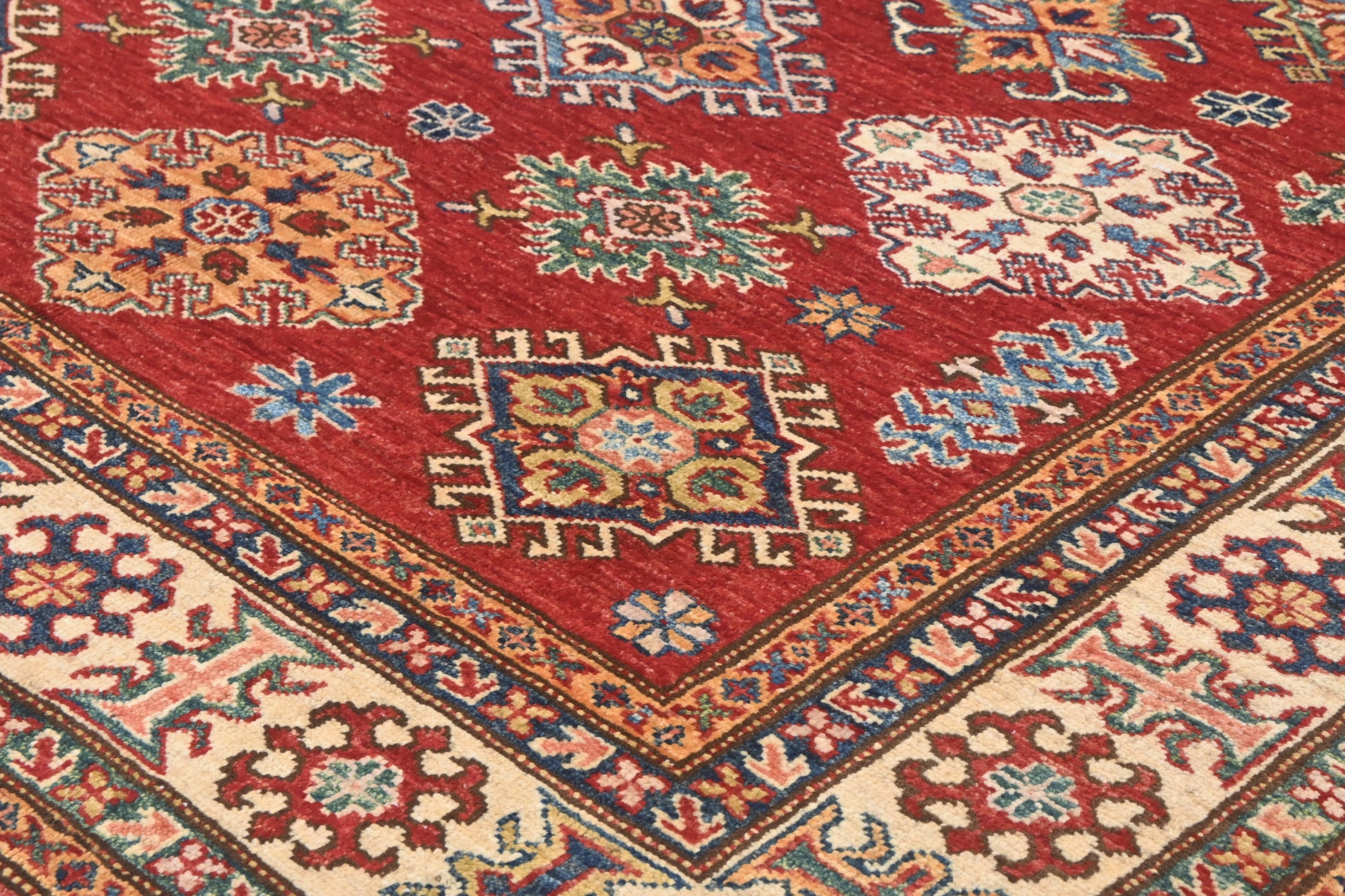 The Kazak rug originates not, as one might think, from Kazakhstan, but rather from the border region where Azerbaijan, Georgia and Armenia trisect. They usually exhibit bright reds and strong blues, and often have three medallions of approximately equal size spaced vertically up the carpet.