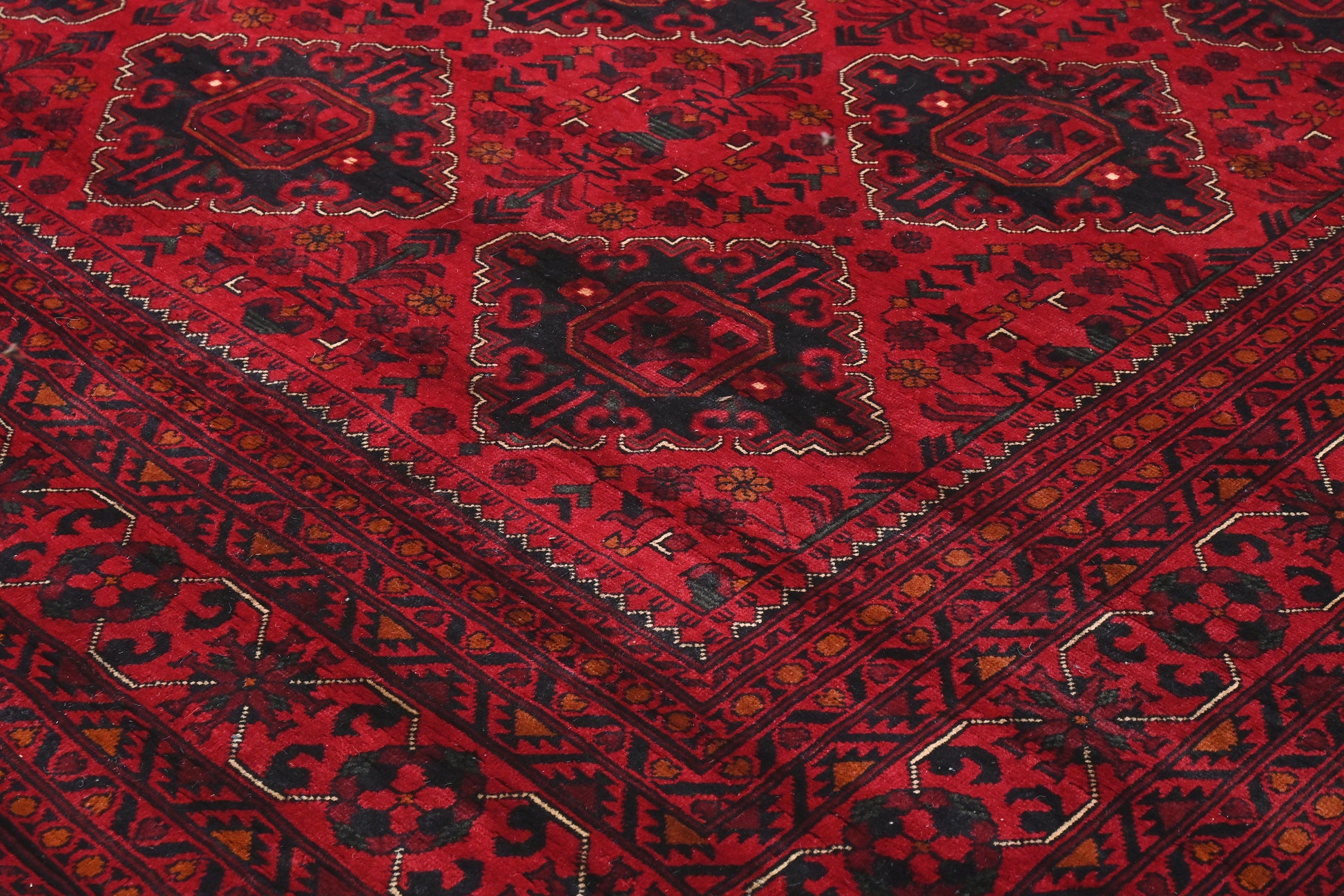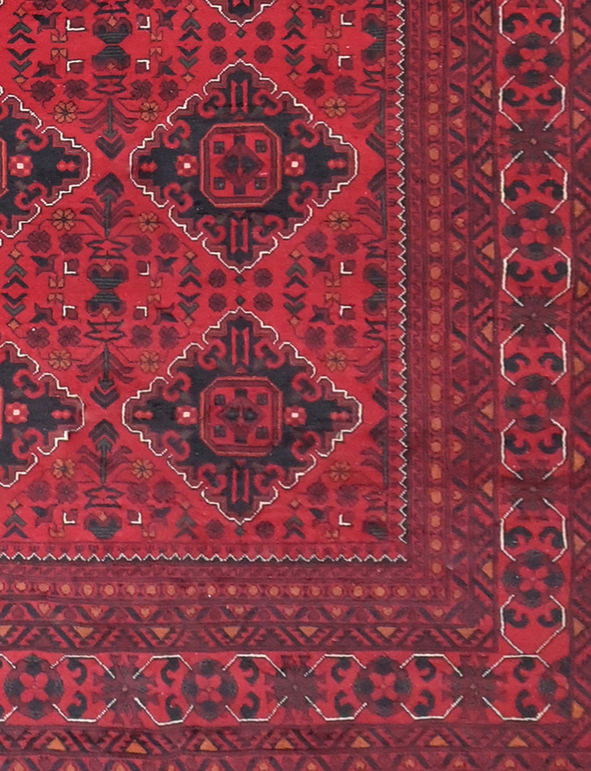 With most oriental rugs taking their names from places or tribes, Khal Mohammadi rugs are notable for their being named after a person. Khan Mohammad was an influential rug weaver who developed what has become something of a classic design among Afghan carpets. They are characterised generally by their deep (usually red) colours and well balanced, repeating designs, which are made up usually of a mixture of geometric and stylised floral patterns. These rugs have a medium length pile, giving them a velvet like texture, and are hand-knotted in the North of Afghanistan using high quality hand-spun wool.
