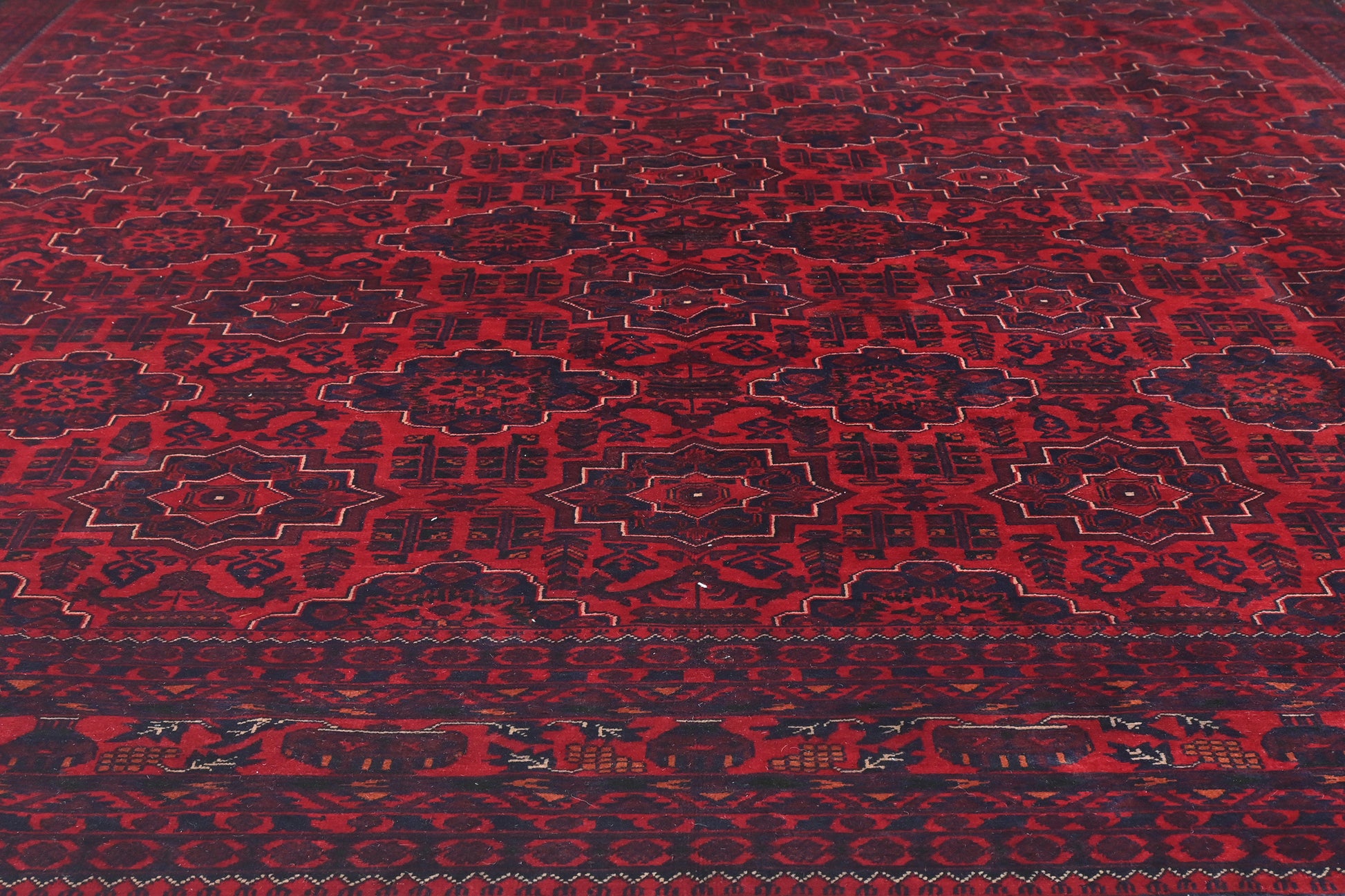 With most oriental rugs taking their names from places or tribes, Khal Mohammadi rugs are notable for their being named after a person. Khan Mohammad was an influential rug weaver who developed what has become something of a classic design among Afghan carpets. They are characterised generally by their deep (usually red) colours and well balanced, repeating designs, which are made up usually of a mixture of geometric and stylised floral patterns. These rugs have a medium length pile, giving them a velvet like texture, and are hand-knotted in the North of Afghanistan using high quality hand-spun wool.