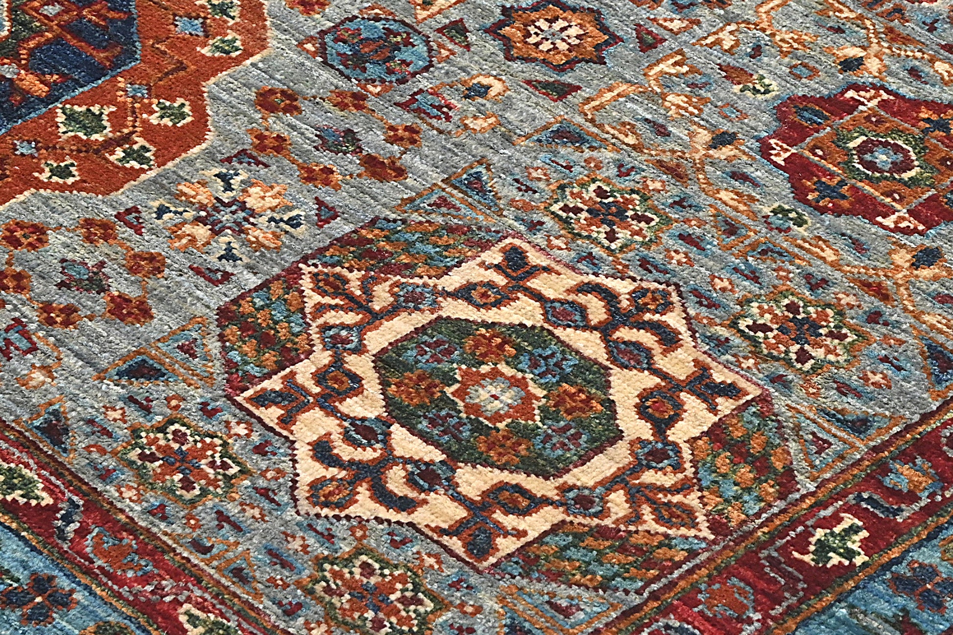Mamluks were a formidable warrior class in the Arab world from around the ninth century to the nineteenth, and it is after them for whom these rugs are named. The style originated in Egypt around the 15th century, and were were prized luxury imports during the renaissance period, appearing in Venetian paintings as early as the 16th century. Mamluk rugs are characterised by their distinctive, almost circular central motif, around which are usually placed similar geometric motifs echoing the centre.