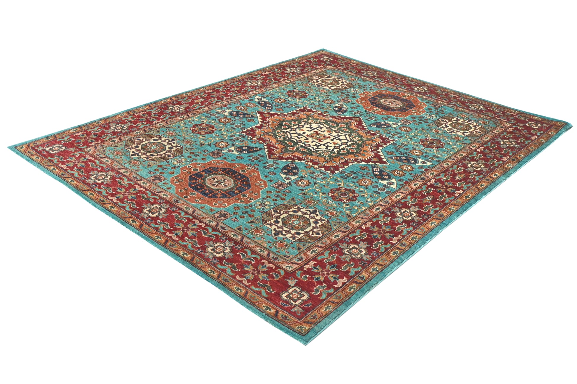 Mamluks were a formidable warrior class in the Arab world from around the ninth century to the nineteenth, and it is after them for whom these rugs are named. The style originated in Egypt around the 15th century, and were were prized luxury imports during the renaissance period, appearing in Venetian paintings as early as the 16th century. Mamluk rugs are characterized by their distinctive, almost circular central motif, around which are usually placed similar geometric motifs echoing the centre.