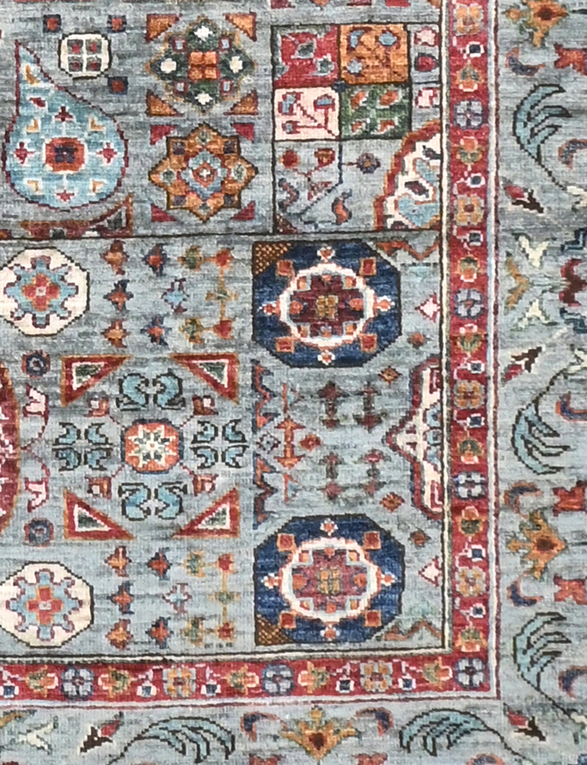 Mamluks were a formidable warrior class in the Arab world from around the ninth century to the nineteenth, and it is after them for whom these rugs are named. The style originated in Egypt around the 15th century, and were were prized luxury imports during the renaissance period, appearing in Venetian paintings as early as the 16th century. Mamluk rugs are characterised by their distinctive, almost circular central motif, around which are usually placed similar geometric motifs echoing the centre.
