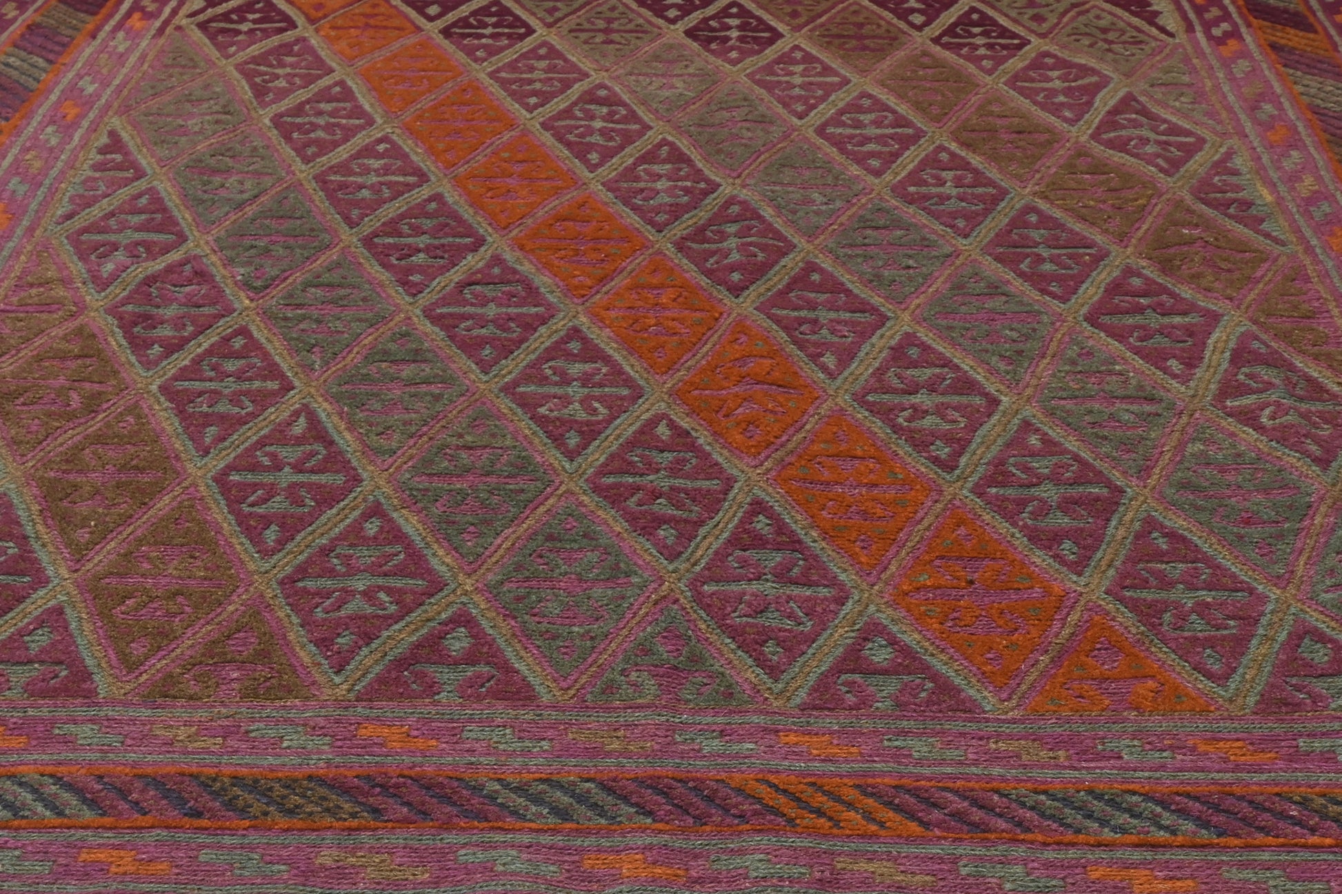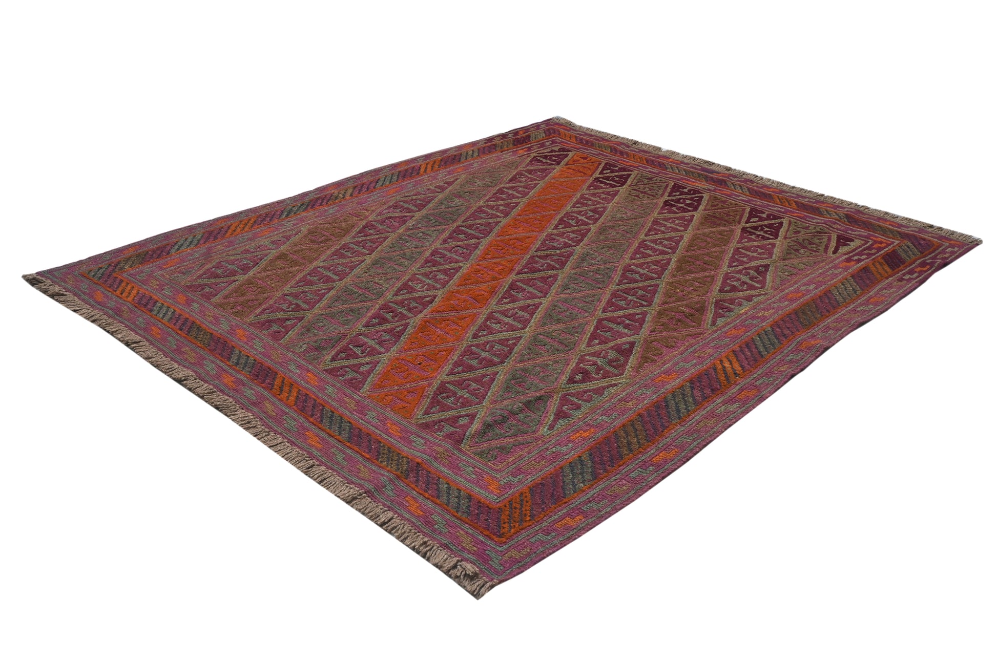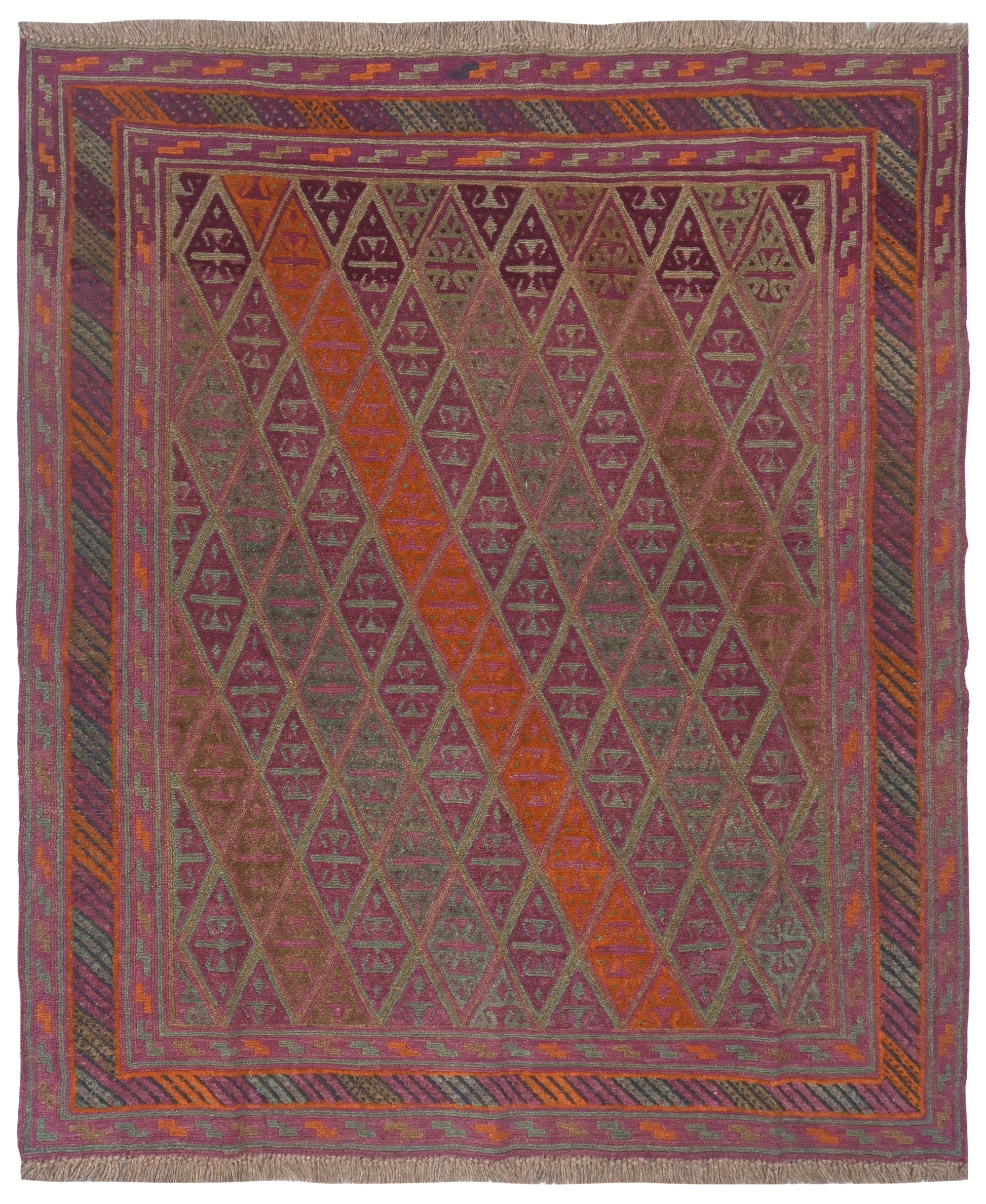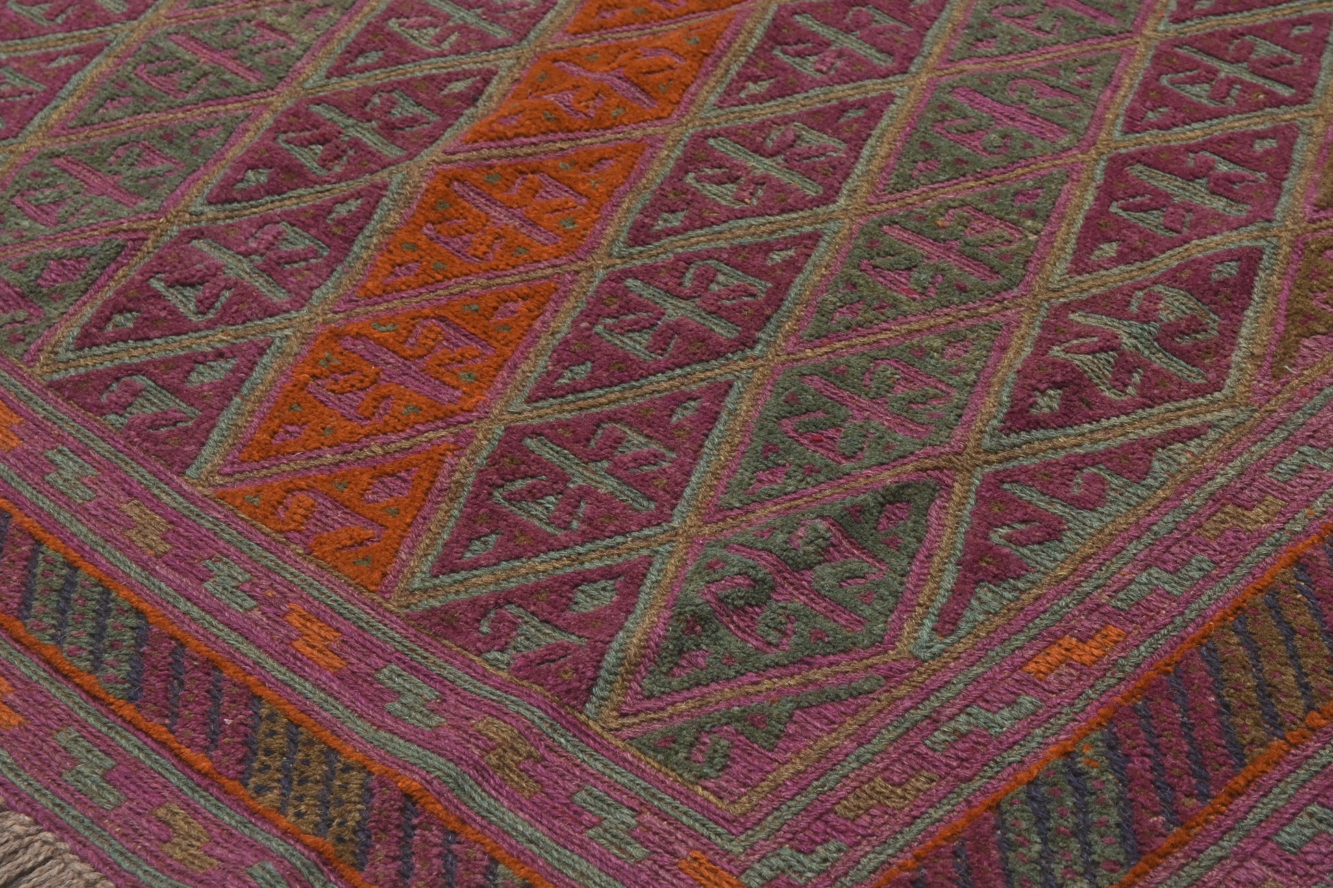 Meshwani rugs are very unusual, due to their construction which blends flat-weave kilim and pile styles. This mixture creates a three dimensional texture across the rug.