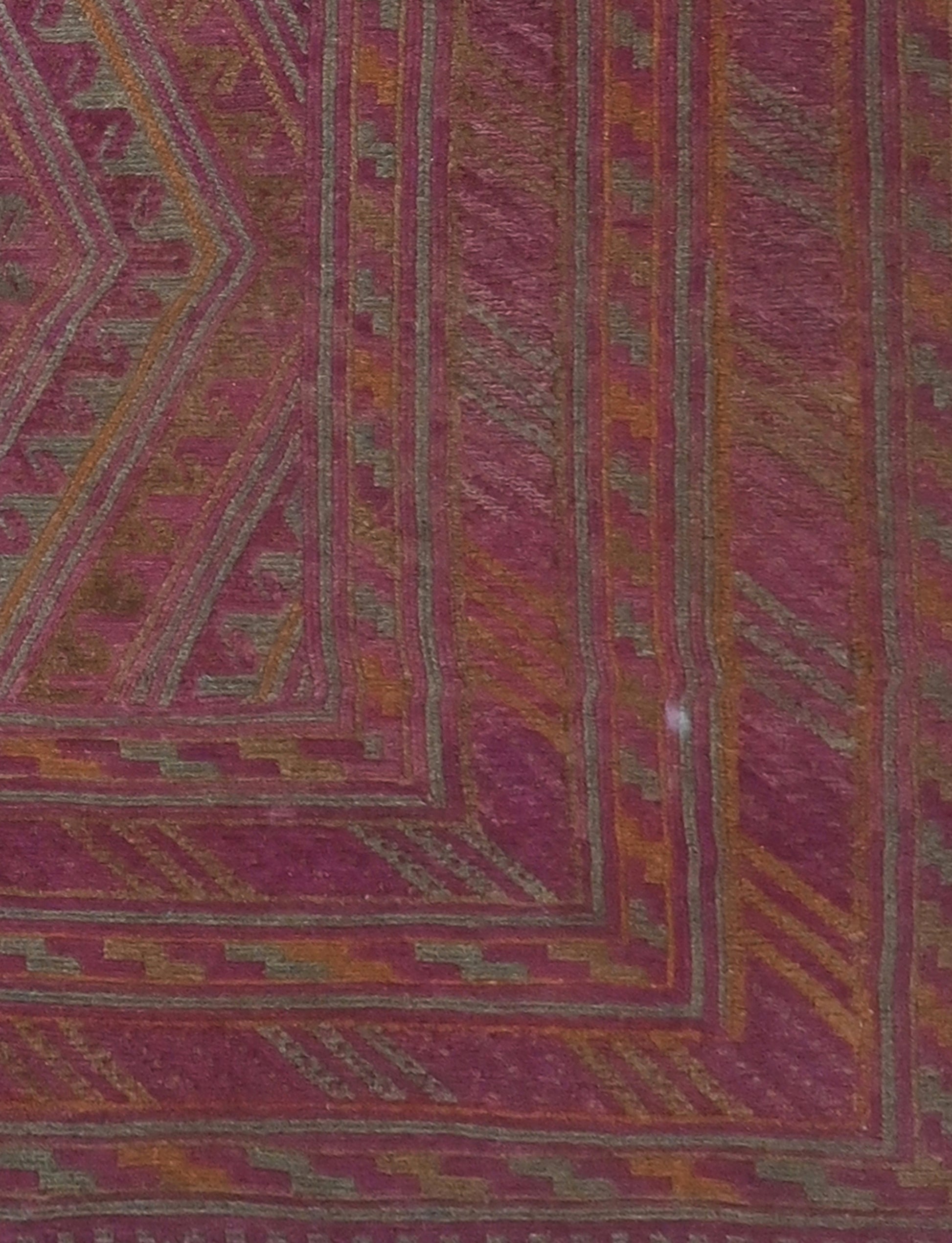 Meshwani rugs are very unusual, due to their construction which blends flat-weave kilim and pile styles. This mixture creates a three dimensional texture across the rug.