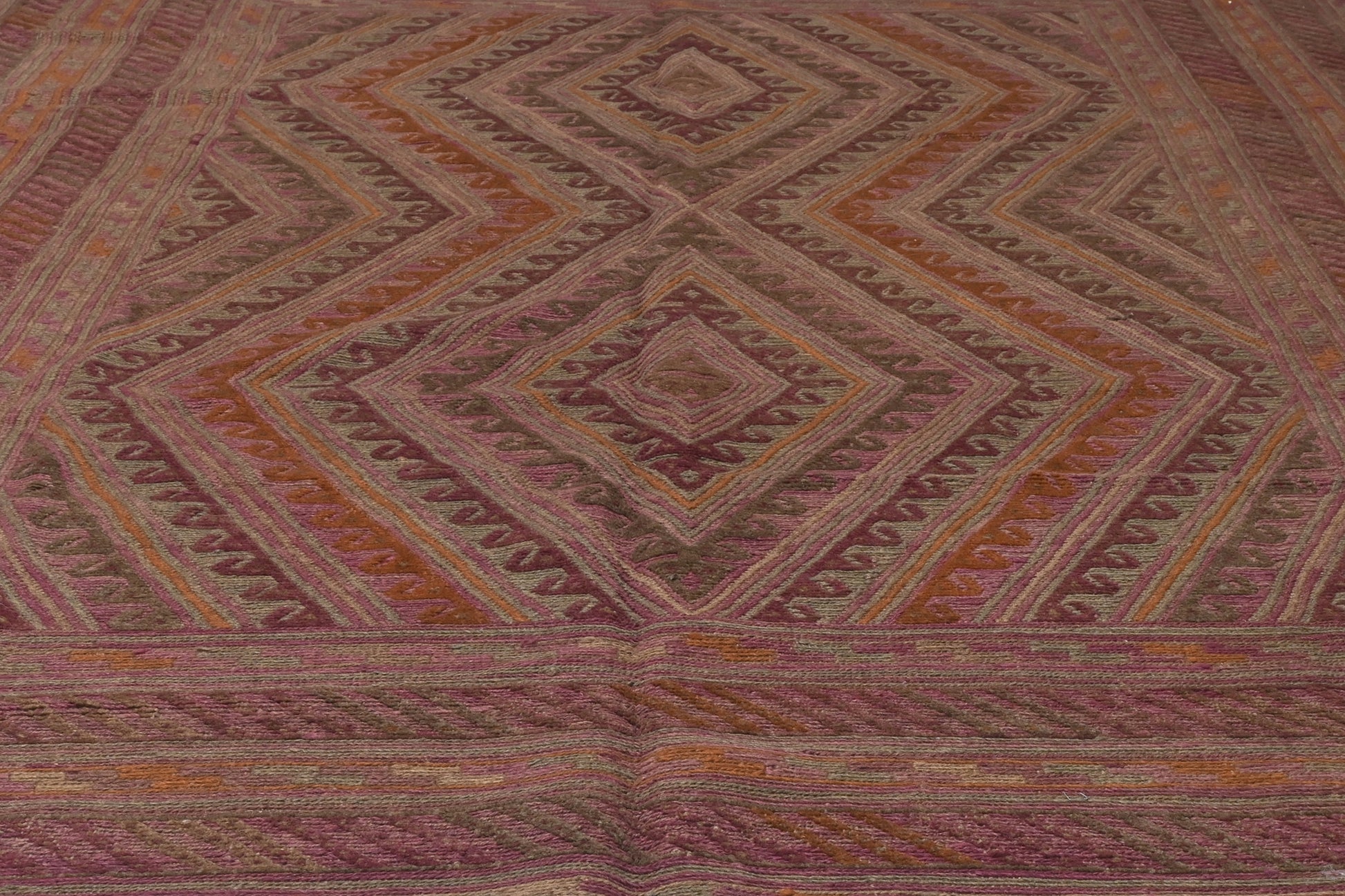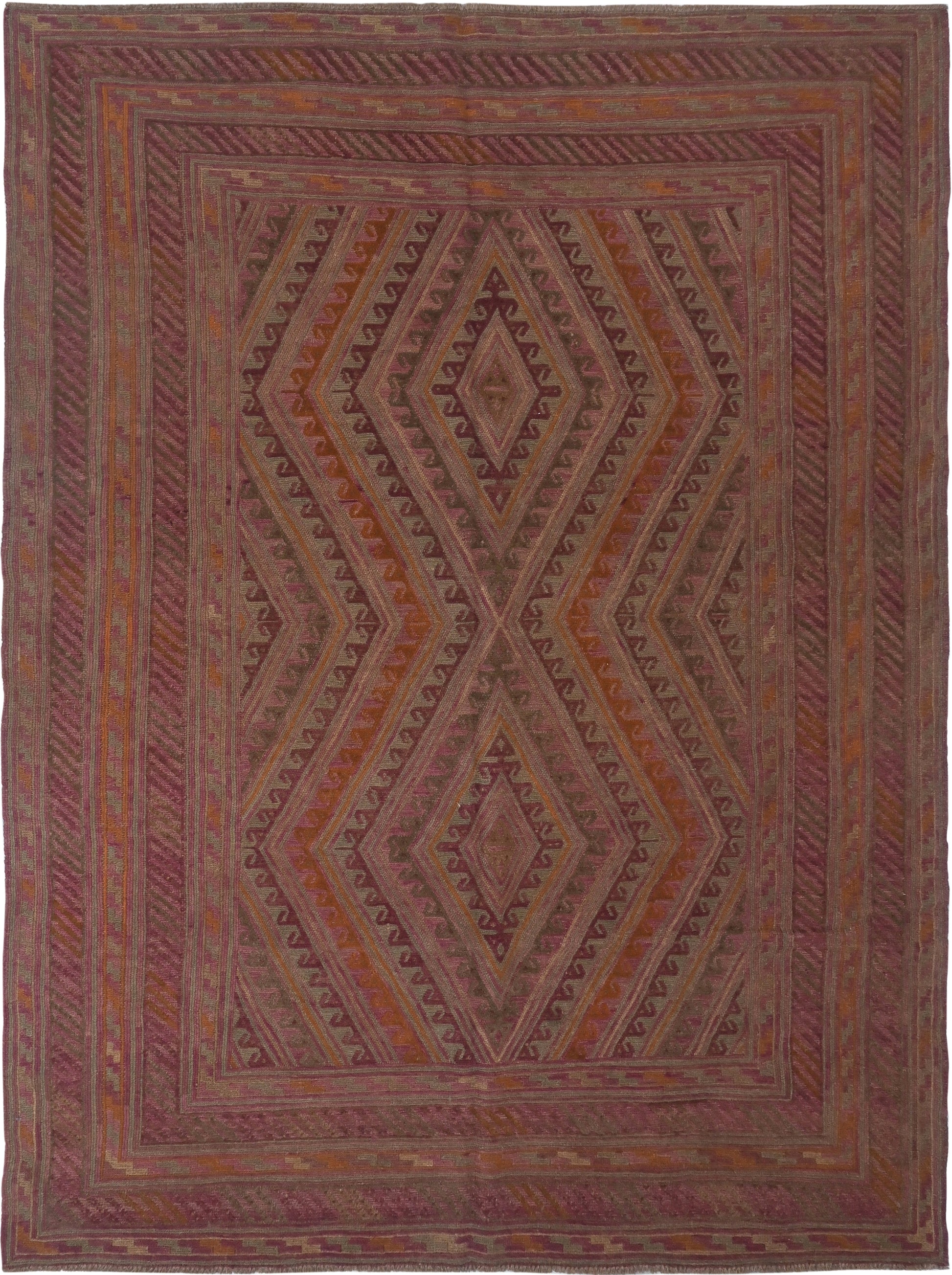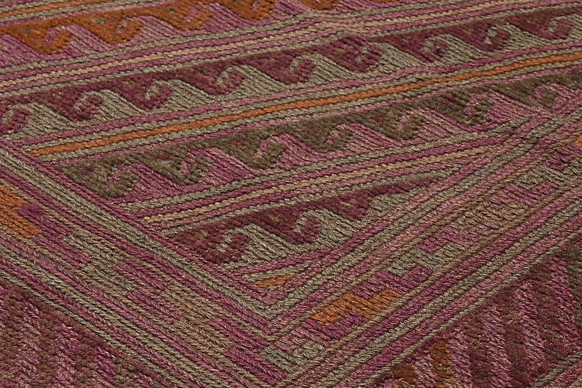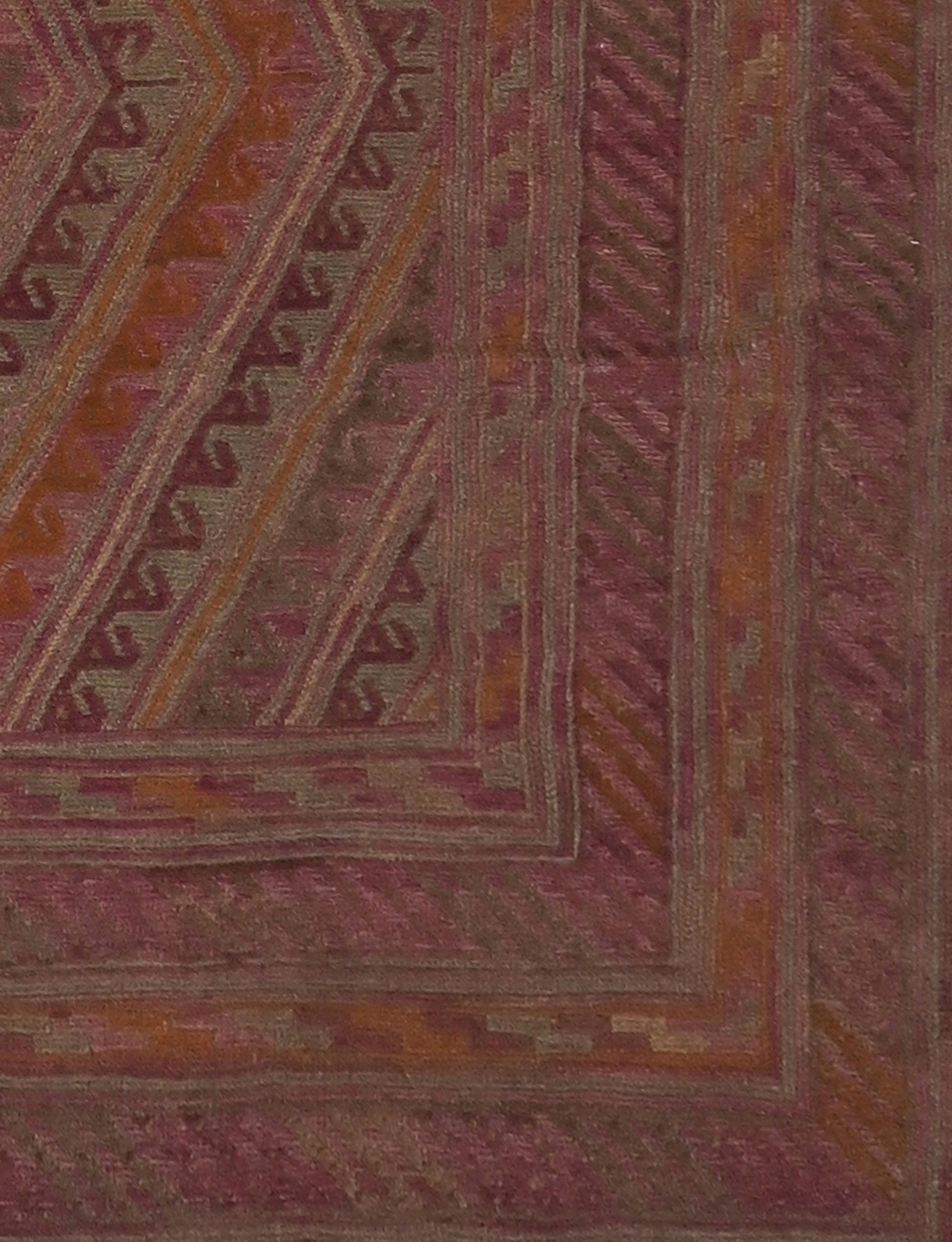 Meshwani rugs are very unusual, due to their construction which blends flat-weave kilim and pile styles. This mixture creates a three dimensional texture across the rug.