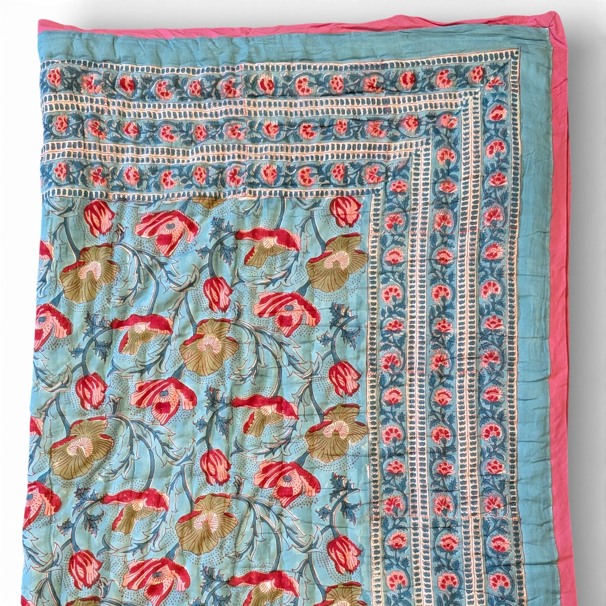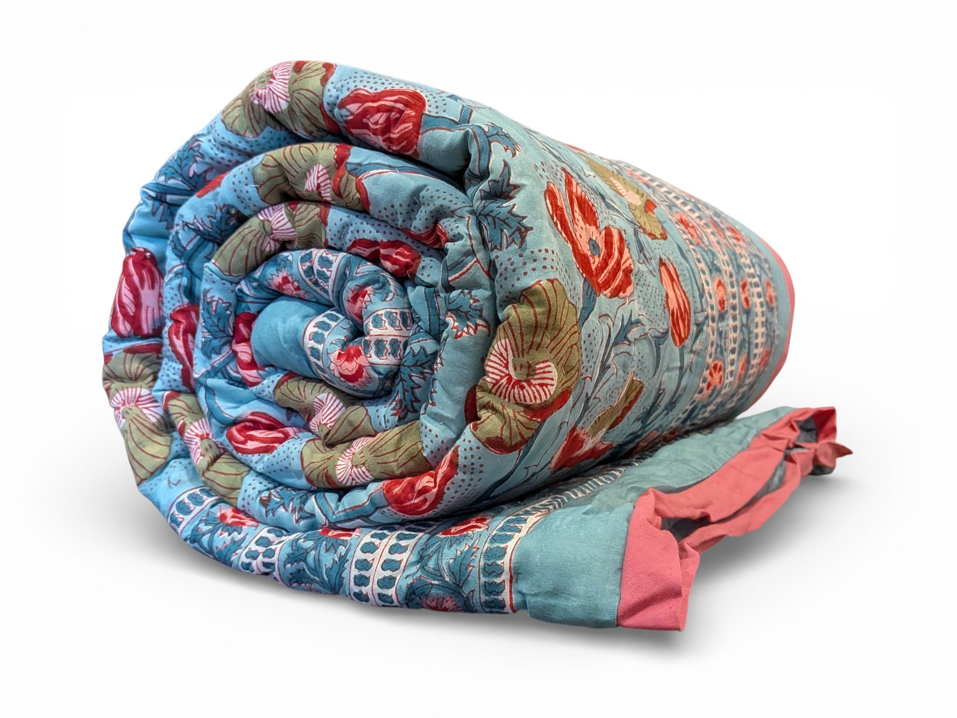 Experience the timeless luxury of an authentic Jaipuri Razai quilt, handcrafted by master artisans in Rajasthan using centuries-old techniques. Filled with layers of carded pure cotton and wrapped in feather-soft mulmul cotton with exquisite hand block prints, these iconic Indian quilts are incredibly lightweight (under 2 kg) yet remarkably warm – perfect for British winters or cool summer nights.