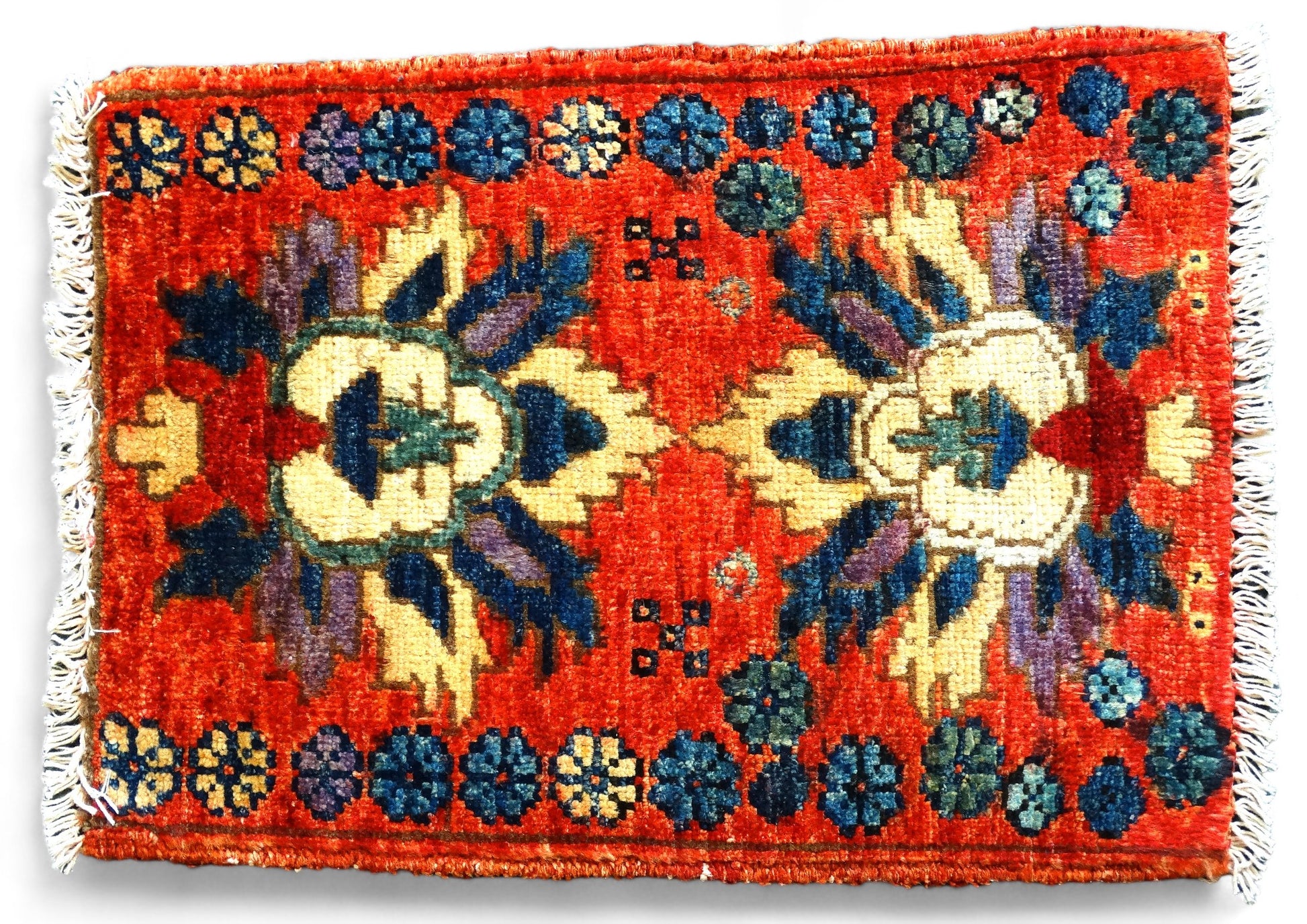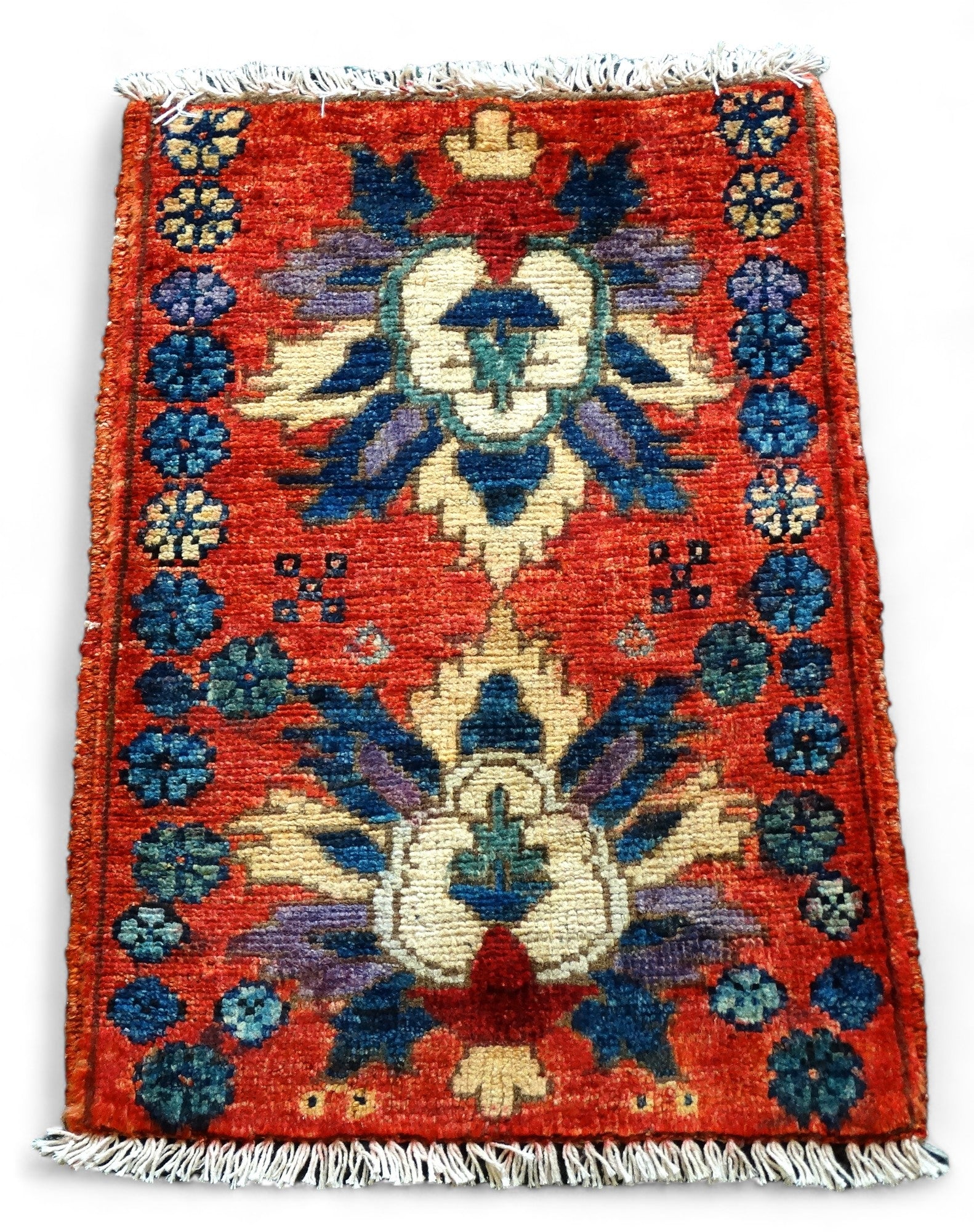 This unique small Chobi rug is hand-knotted in Afghanistan, and measures approximately 60cm by 40cm.